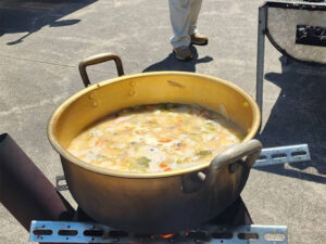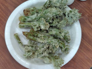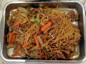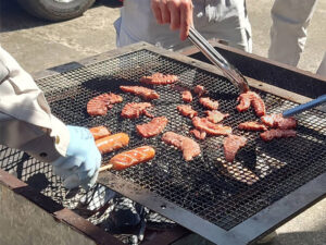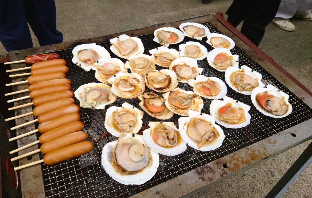 今回のメニューは、焼肉・フランクフルト・ホタテ・タラの芽の天ぷらなどです。